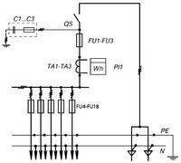 ТипПринципиальная схема первичных соединенийЭлементы на схемеКоличество и номинальный ток однофазных линий освещения